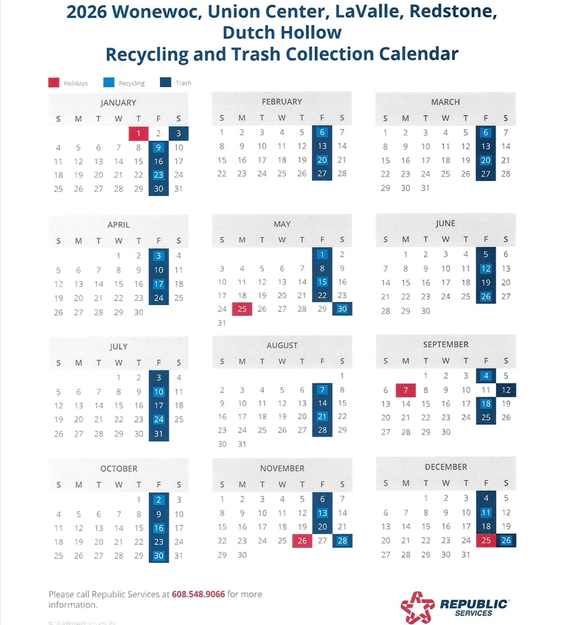 Republic Services vehicles are in the Village every Friday for garbage pick-up. All garbage/rubbish must be put in the One-Pass bin and placed curbside by 6:00 a.m., on Friday mornings.